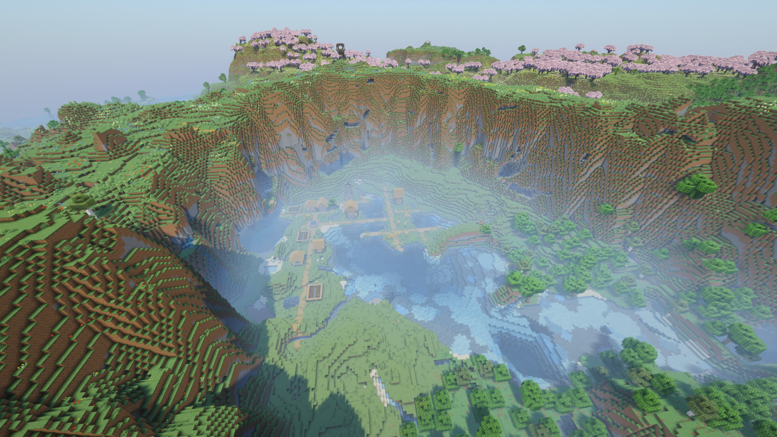 The cherry blossom biome is the highlight of this seed. Its pink foliage, scattered flowers, and unique tree patterns create a visually stunning environment perfect for building and exploration.