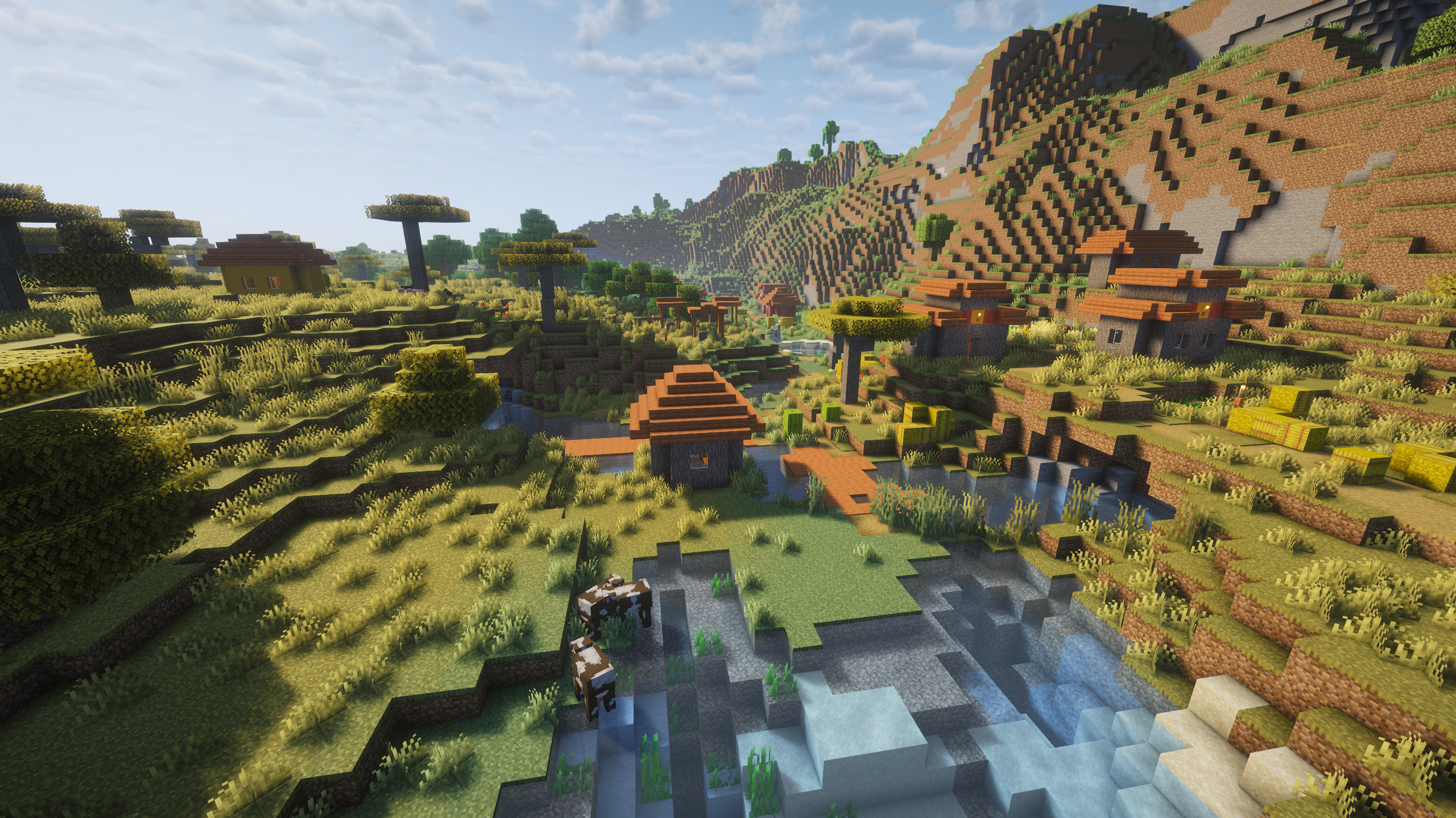 This rare Minecraft Seed spawns players near one of the most breathtaking environments imaginable. A savanna village sits high on the edge of a massive natural crater, overlooking a deep basin carved into the land. At the center of this crater lies a calm lake fed by waterfalls cascading down steep cliffs.