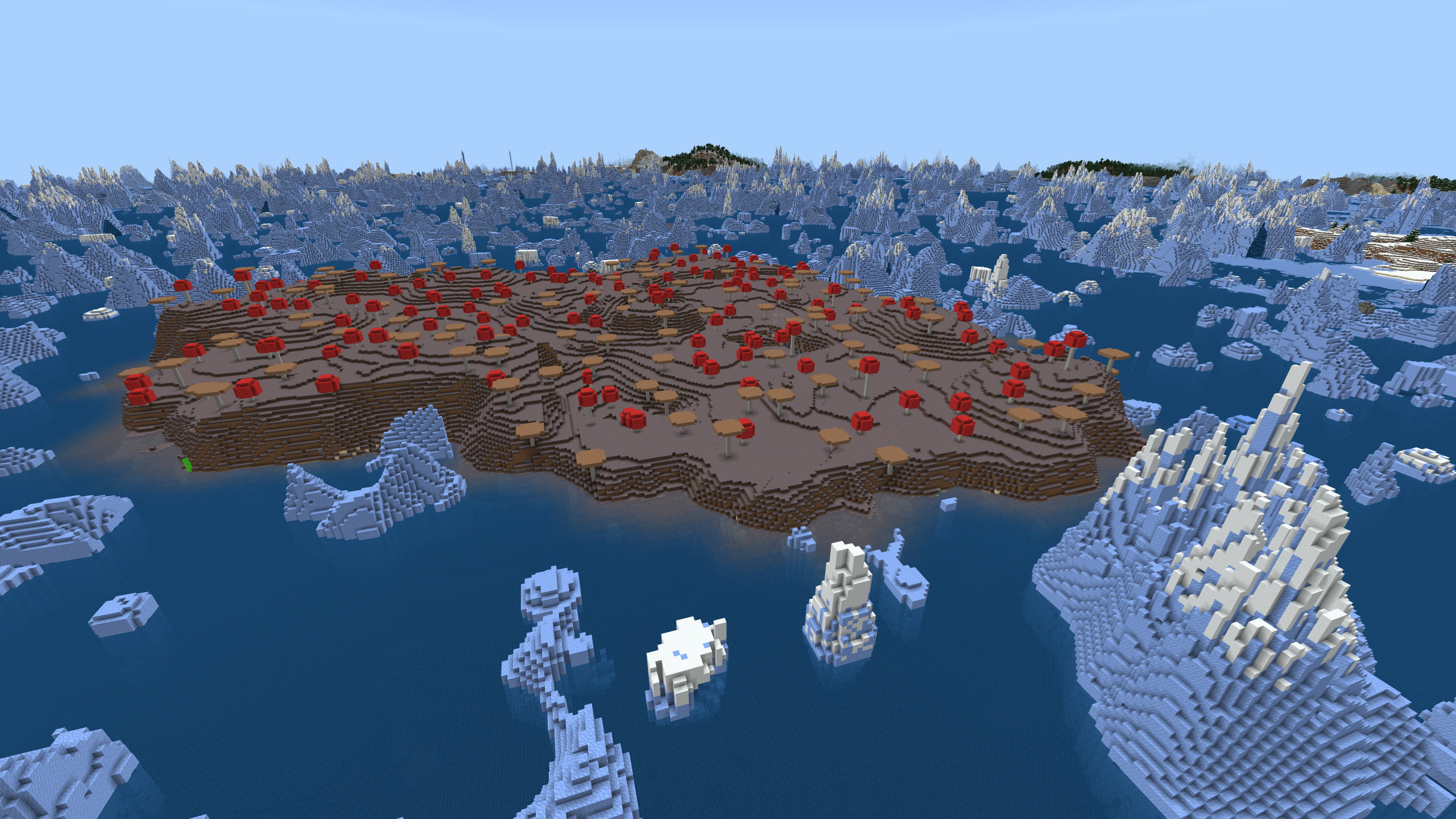 This seed combines a Mushroom Island, massive ocean spawn, Ice Spikes biome, and a single brown mushroom — an extremely rare combination.