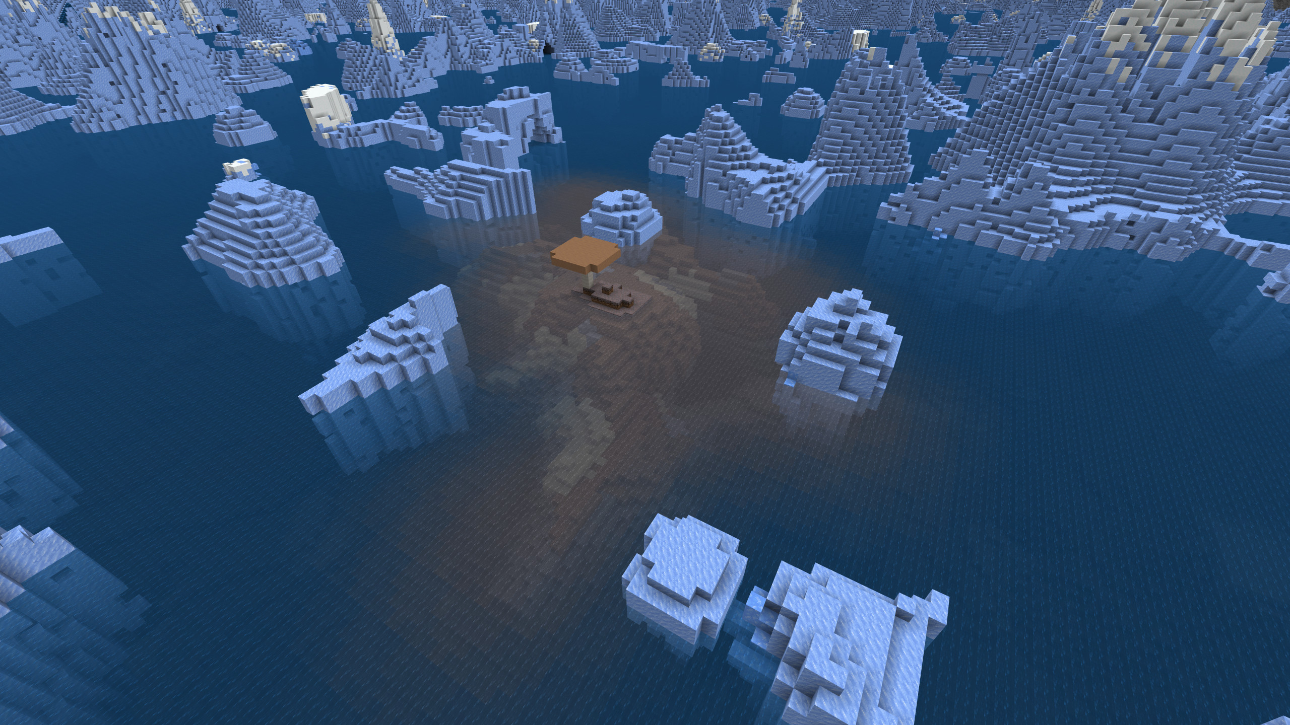 Not far from the Mushroom Island, you’ll find a small Ice Spikes island, surrounded by water. Ice Spikes biomes are already rare, but seeing one isolated in the ocean is unusual.
