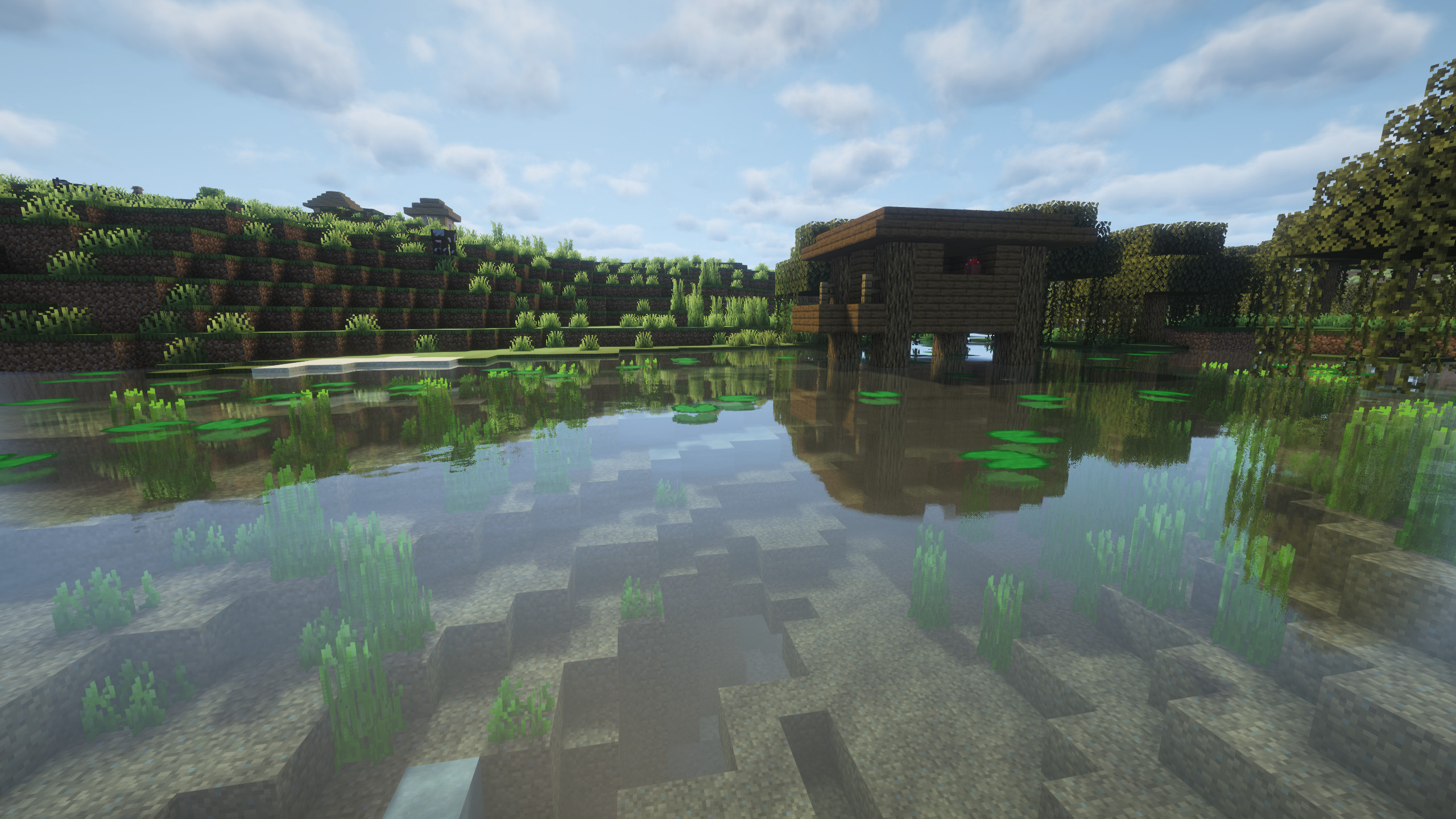 Upon spawning in this Minecraft 1.21.10 seed with village, players are immediately immersed in an underwater swamp environment. This unusual spawn makes the early-game survival experience challenging yet rewarding. The swamp is filled with water patches, shallow pools, and multiple witch huts, creating a perfect environment for early-game farms, exploration, and creative building.