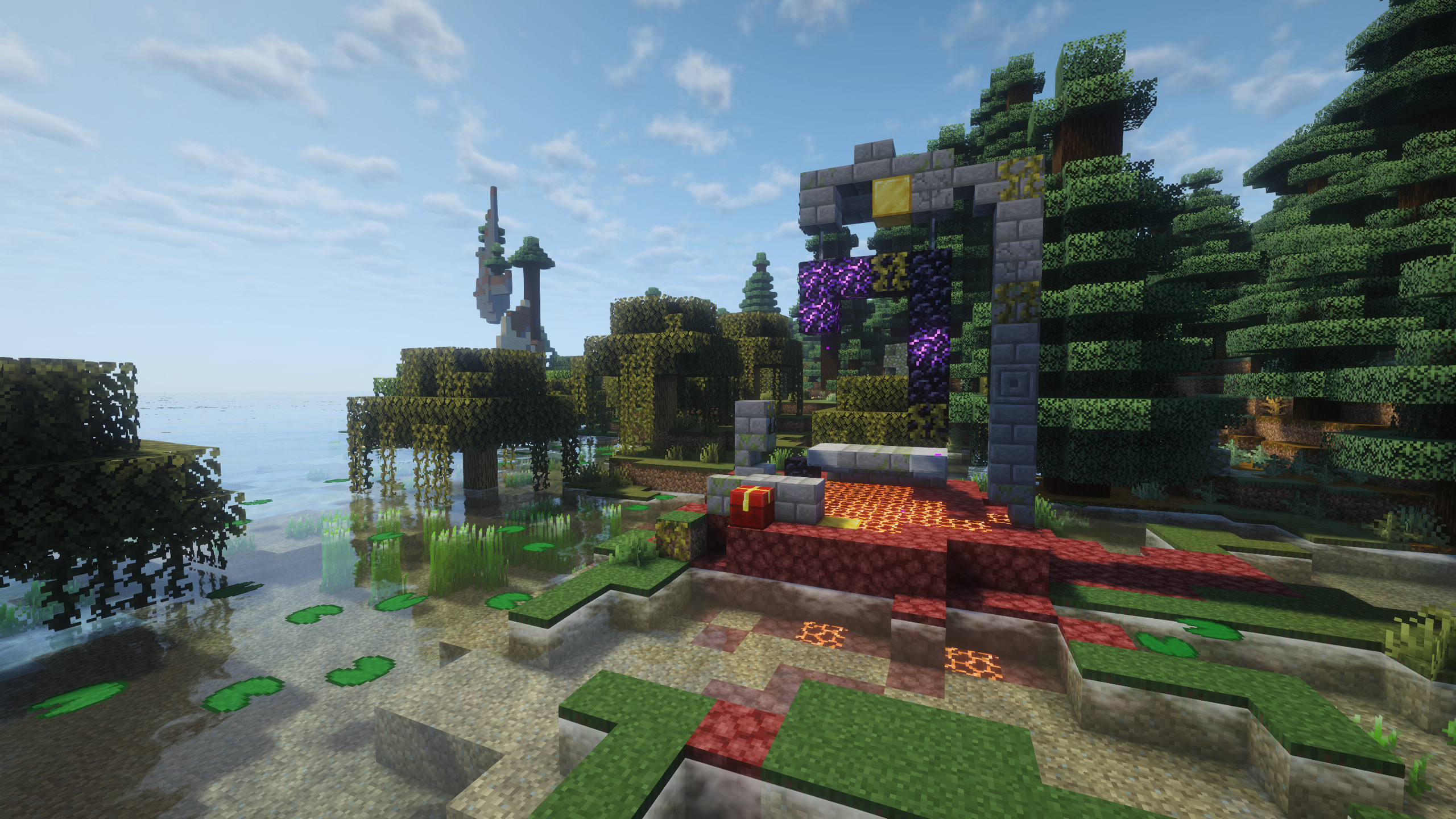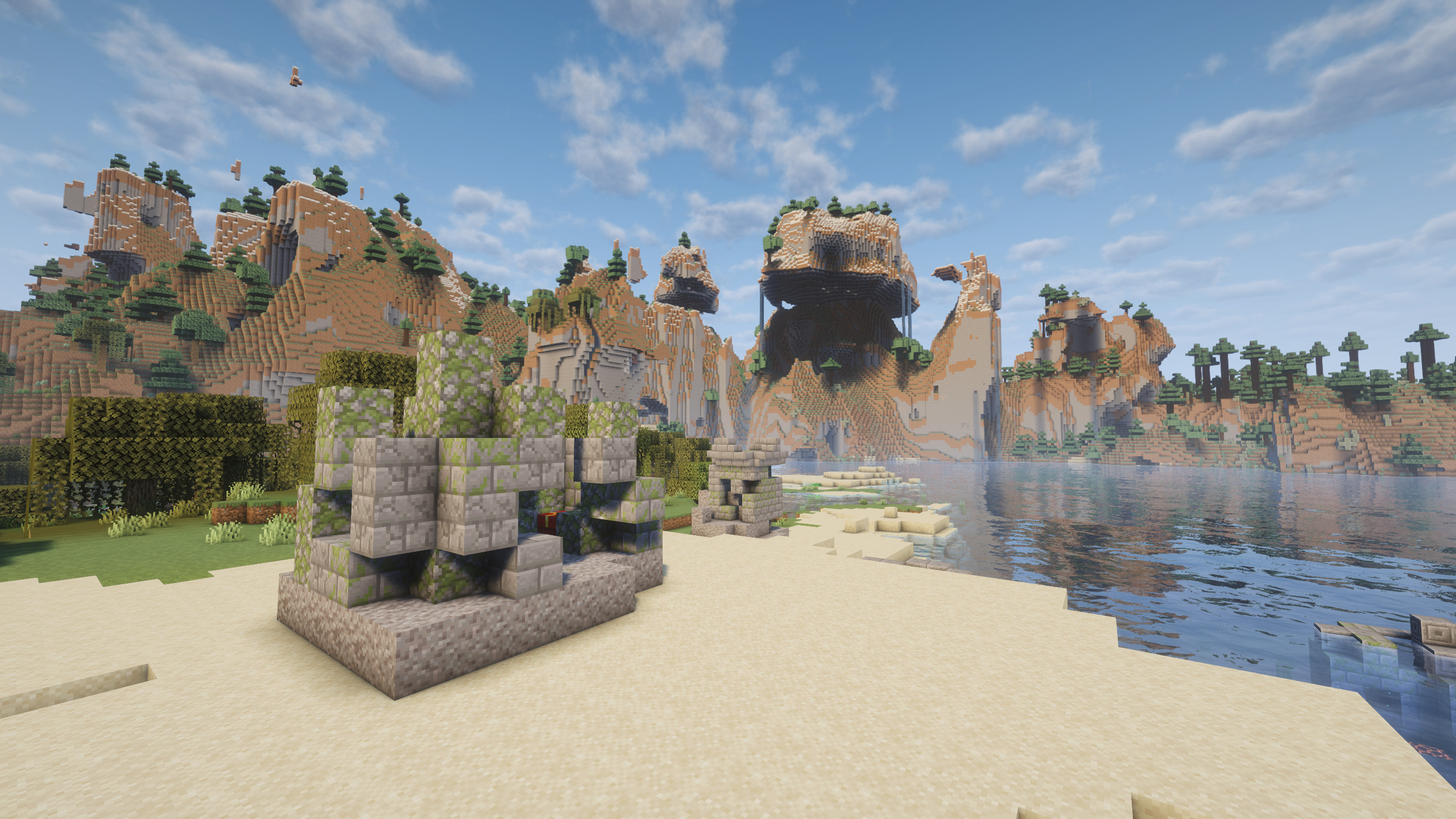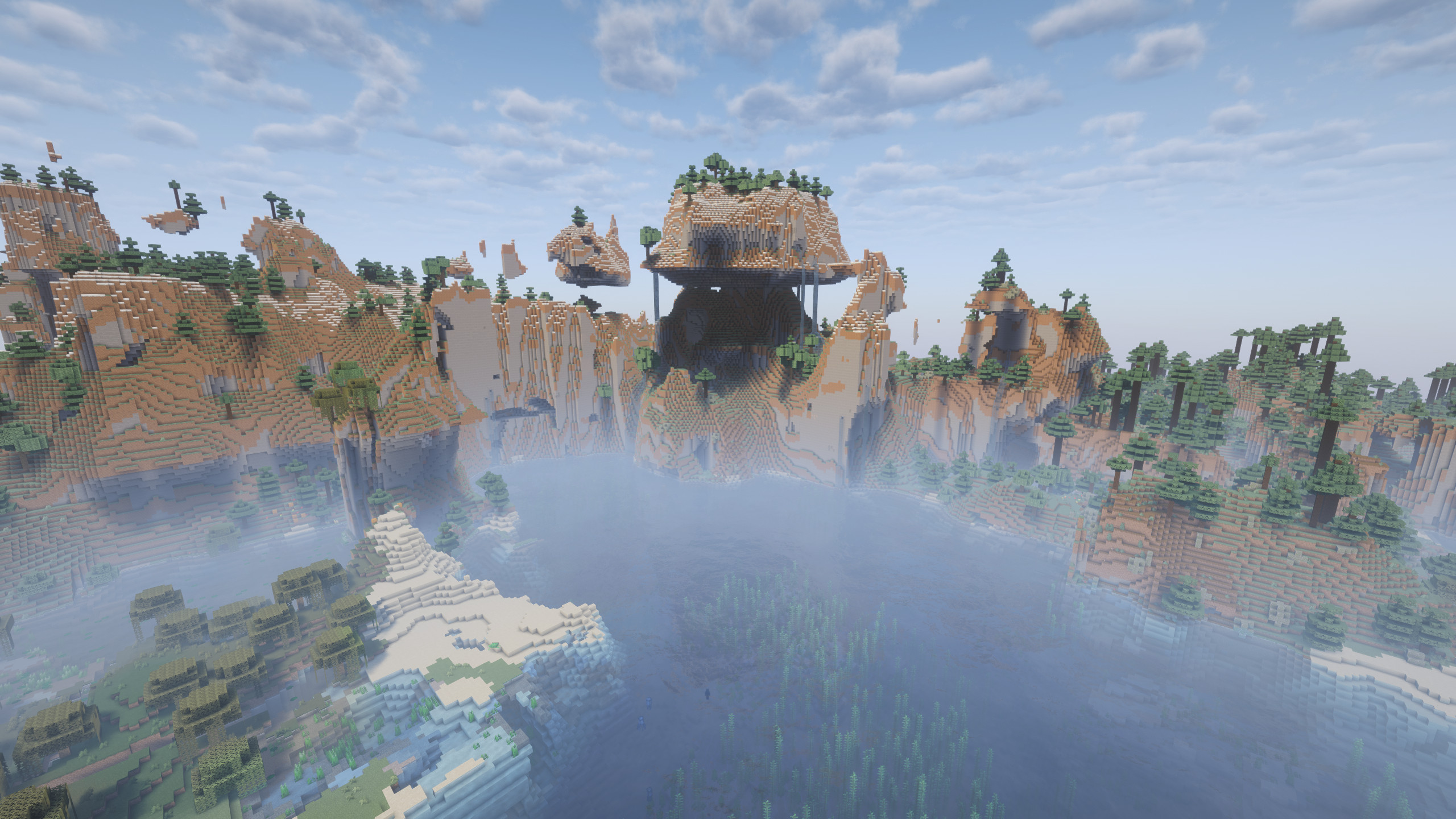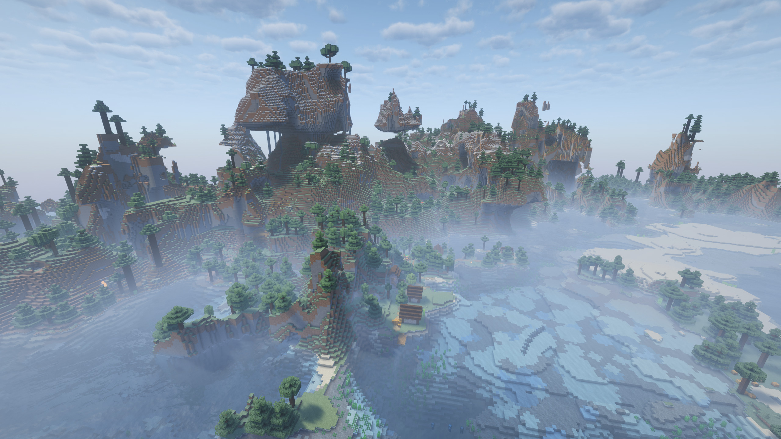 The spruce jungle spreads around the base of these floating islands, giving dense foliage, tall trees, and hidden caves. This jungle is perfect for gathering wood, food, and wildlife. Nearby, the ocean biome stretches into the horizon, offering fishing opportunities, water-based builds, and access to shipwrecks or underwater ruins.