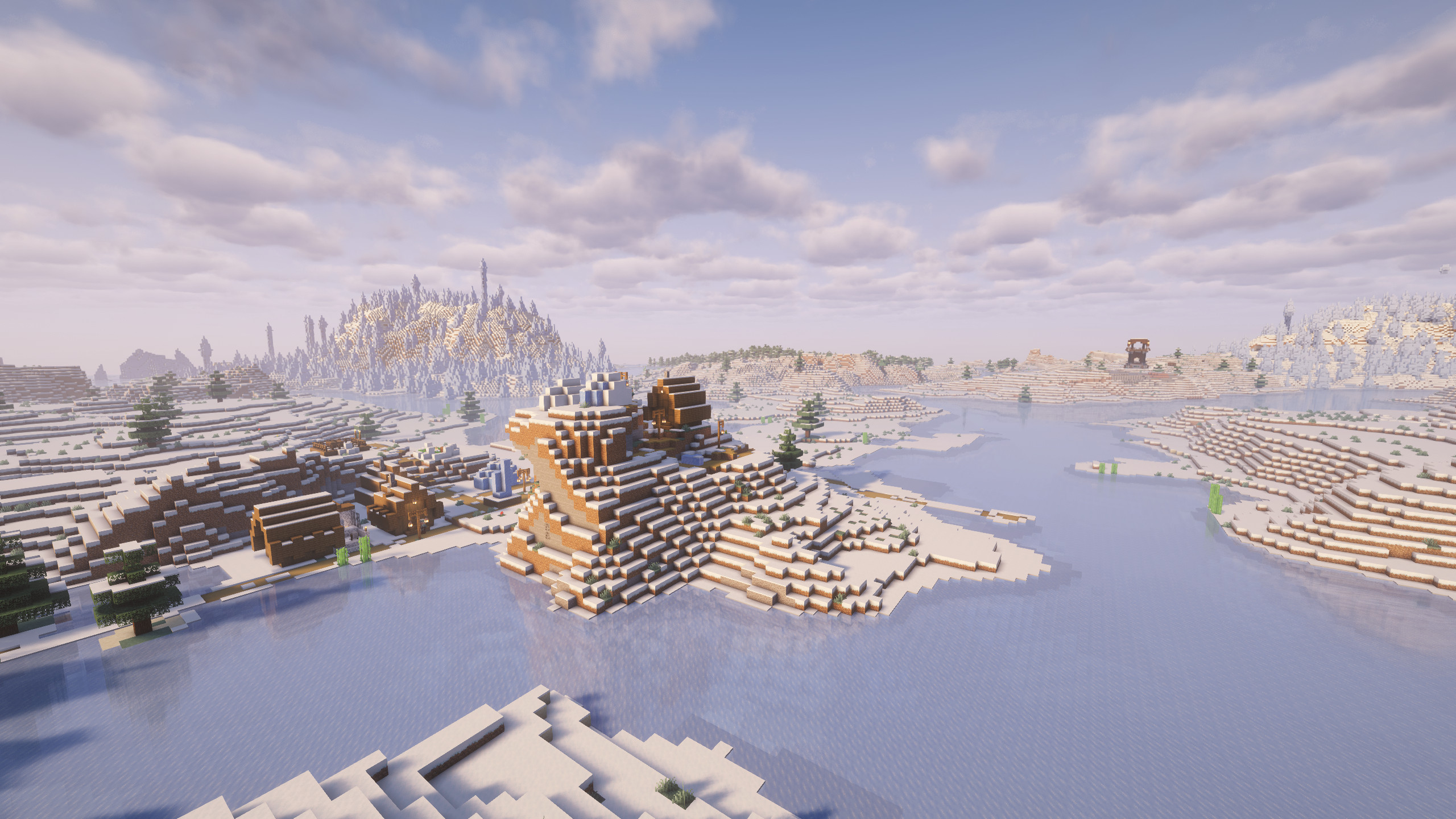 For players seeking a Minecraft seed for hardcore survival, the Winterhold biome is an extraordinary choice. This seed offers an incredible blend of survival challenge, cinematic scenery, and strategic gameplay. Spawning near a snowy village perched on a Frozen Peak, the Winterhold seed gives immediate access to resources, shelter, and trading opportunities with villagers, all while surrounded by rugged, icy terrain. The nearby snow-covered spruce forests, icy spikes, massive mountain ridges, and a river cutting through green plains provide diverse biomes that allow both survival and creativity.