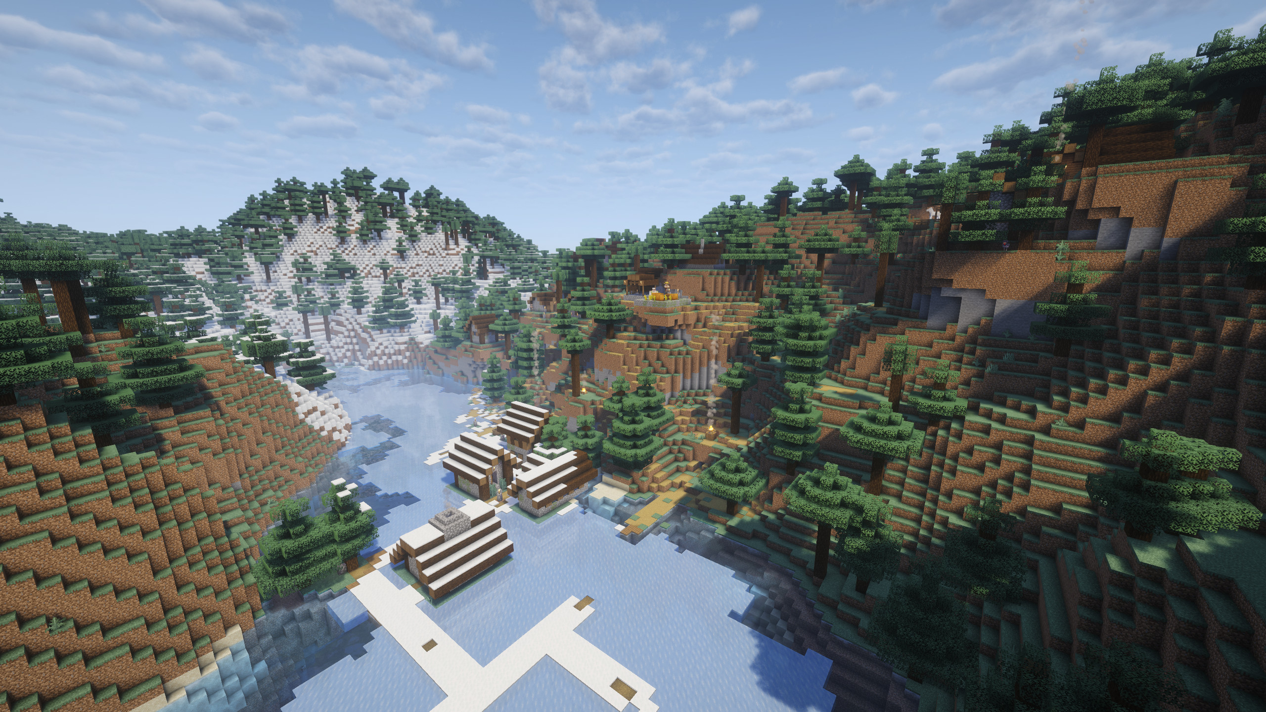 Near spawn, the village is split between the forest and icy plains, giving a unique visual contrast. This arrangement not only looks cinematic but also provides early access to food, tools, and trading opportunities.