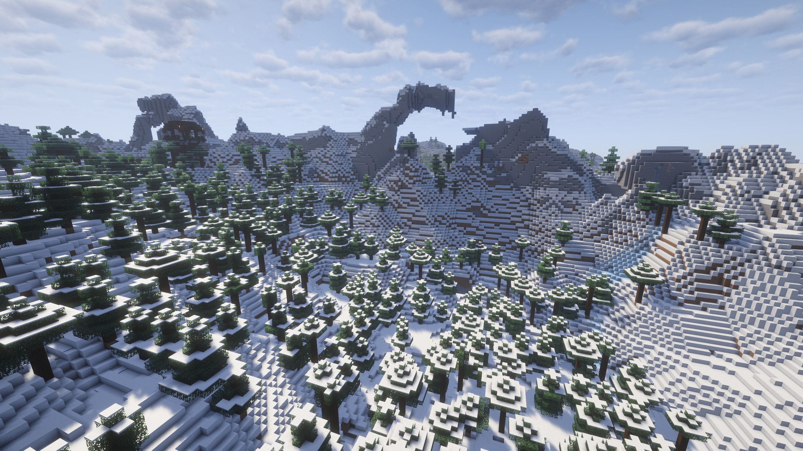 Rare biome mix of snowy mountains, icy plains, spruce forests, and lush caves.